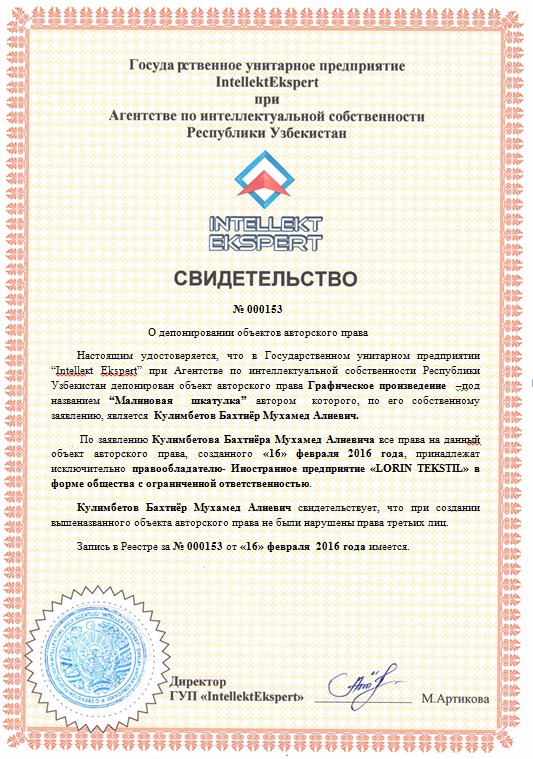 | 10010 | №000153 | Графическое произведение –“Малиновая шкатулка” | Кулимбетов Бахтиёр Мухамед Алиевич. | Иностранное предприятие «LORIN TEKSTIL» в форме общества с ограниченной ответственностью. | 02/16/2016 | ![]() |