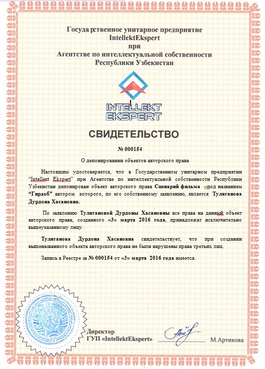 | 10009 | №000154 | Сценарий фильма –“Гирдоб” | Туляганова Дурдона Хасановна. | Туляганова Дурдона Хасановна. | 03/03/2016 | ![]() |