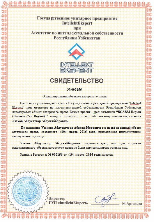 | 10007 | №000156 | Бизнес-проект –“BCARM Region (Business Car Region) ” | Узаков Абдусаттор Абдужабборович | Узаков Абдусаттор Абдужабборович | 03/10/2016 | ![]() |