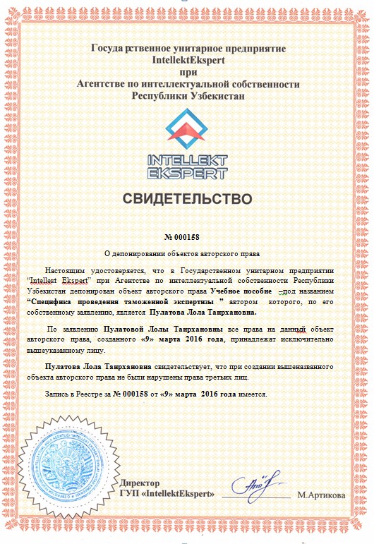 | 10005 | №000158 | Учебное пособие –“Специфика проведения таможенной экспертизы ” | Пулатова Лола Таирхановна | Пулатова Лола Таирхановна | 03/09/2016 | ![]() |