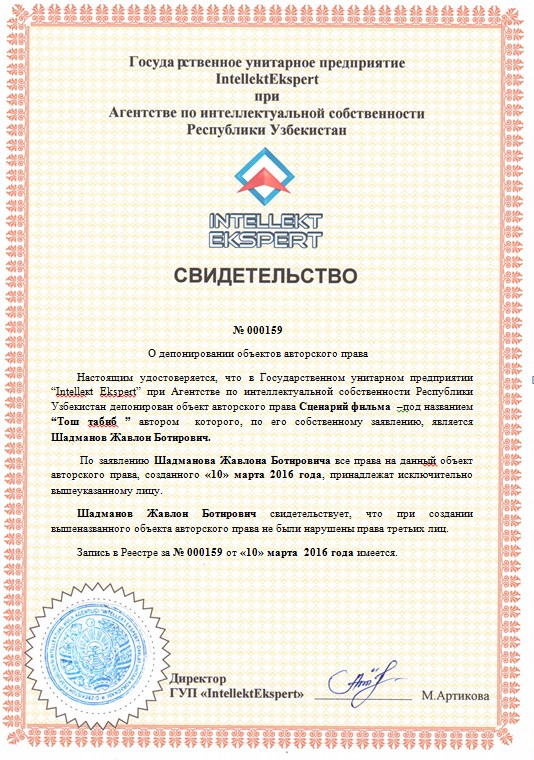 | 10004 | №000159 | Сценарий фильма –“Тош табиб ” | Шадманов Жавлон Ботирович. | Шадманов Жавлон Ботирович. | 03.10.2016 | ![]() |