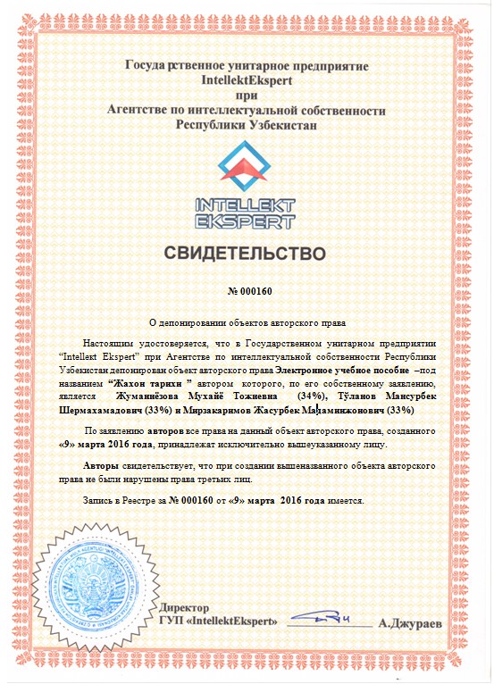 | 10003 | №000160 | Электронное учебное пособие –“Жахон тарихи ” | Жуманиёзова Мухайё Тожиевна (34%), Тўланов Мансурбек Шермахамадович (33%) и Мирзакаримов Жасурбек Мадаминжонович (33%) | Жуманиёзова Мухайё Тожиевна, Тўланов Мансурбек Шермахамадович и Мирзакаримов Жасурбек Мадаминжонович | 09.03.2016 | ![]() |
