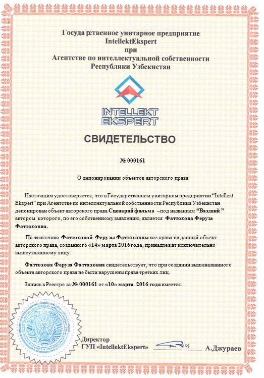 | 10002 | №000161 | Сценарий фильма – “Ваҳший ” | Фаттохова Феруза Фаттаховна | Фаттохова Феруза Фаттаховна. | 10.03.2016 | ![]() |