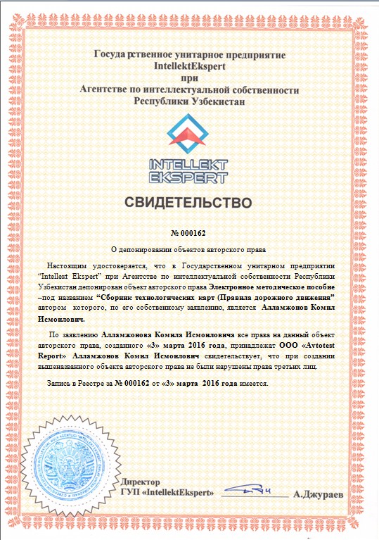 | 10001 | №000162 | Электронное методическое пособие –“Сборник технологических карт (Правила дорожного движения” | Алламжонов Комил Исмоилович | OOO «Avtotest Report» | 03.03.2016 | ![]() |