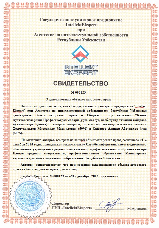 | 10040 | №000123 | Сборник-“Кичик мутахассисларнинг Профессиограммалари (ўрта маҳсус, касб-ҳунар таълими тайёрлов йўналишлари бўйича)” | Холмухамедов Муродулло Махмудович (50%) и Сафаров Алишер Абдукахор ўғли (50%). | Холмухамедов Муродулло Махмудович и Сафаров Алишер Абдукахор ўғли. | 12/21/2015 | ![]() |