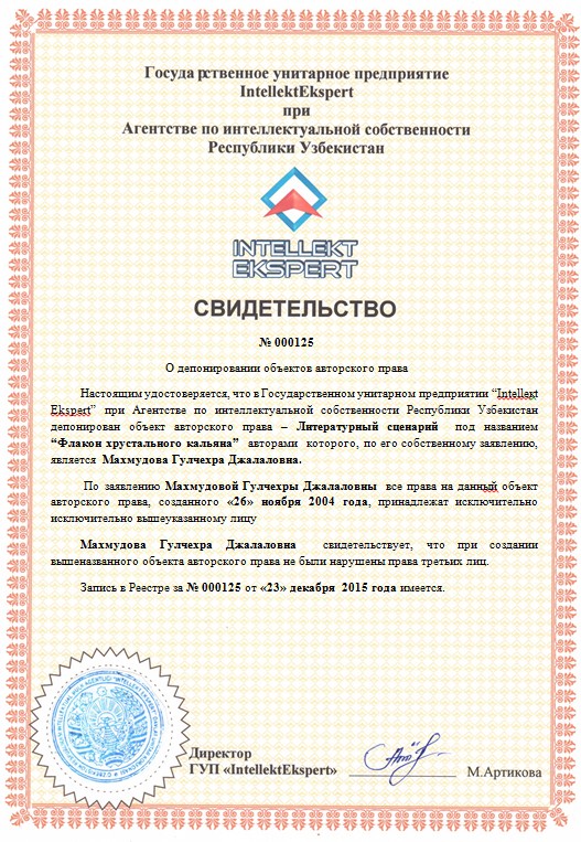 | 10038 | №000125 | Литературный сценарий-“Флакон хрустального кальяна” | Махмудова Гулчехра Джалаловна. | Махмудова Гулчехра Джалаловна. | 11/26/2015 | ![]() |