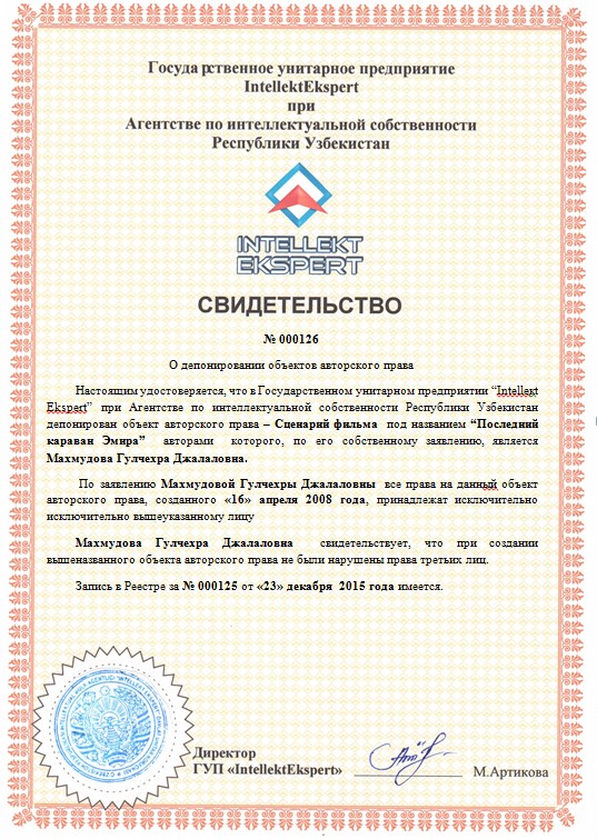 | 10037 | №000126 | Сценарий фильма -“Последний караван Эмира” | Махмудова Гулчехра Джалаловна. | Махмудова Гулчехра Джалаловна. | 12/23/2015 | ![]() |