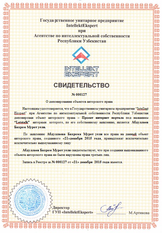 | 10036 | №000127 | Проект интернет портала -“Letstalk” | Абдуллаев Бахром Мурот уғли. | Абдуллаев Бахром Мурот уғли. | 12/21/2015 | ![]() |