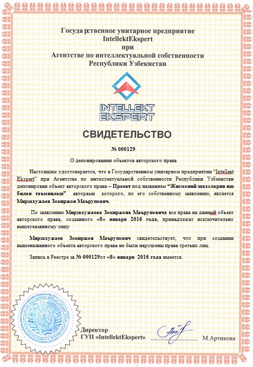 | 10025 | №000138 | Проект-“TIMERO” | Ахмаджонов Нодиржон Комилжон ўгли (50%) и Аллаёров Жасурбек Шавкат ўғли (50%). | Ахмаджонов Нодиржон Комилжон ўгли и Аллаёров Жасурбек Шавкат ўғли. | 01/28/2016 | ![]() |