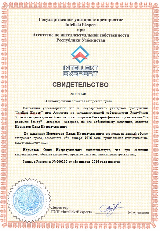 | 10033 | №000130 | Сценарий фильма-“9-рақамли бемор” | Норматов Одил Нусратуллаевич. | Норматов Одил Нусратуллаевич. | 01/08/2016 | ![]() |