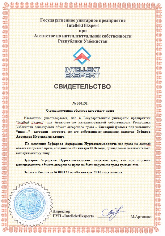 | 10032 | №000131 | Сценарий фильма -“ишқ!...” | Зуфаров Ахроржон Нурмахаммадович. | Зуфаров Ахроржон Нурмахаммадович. | 01/08/2016 | ![]() |
