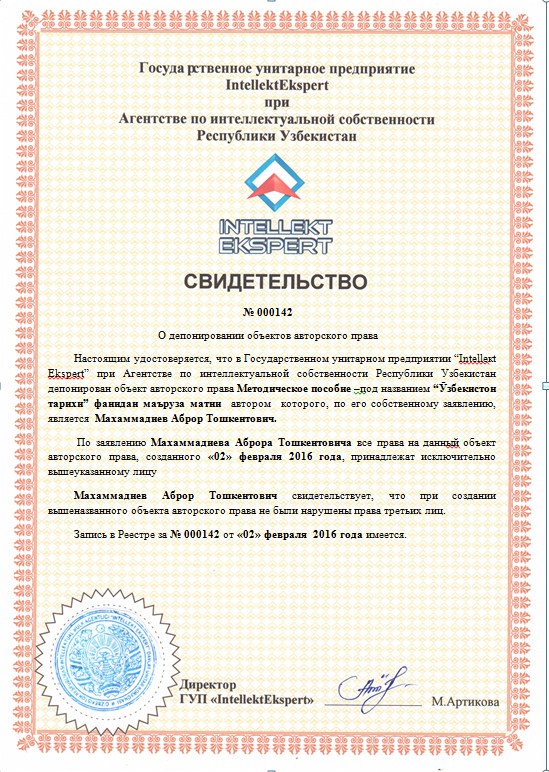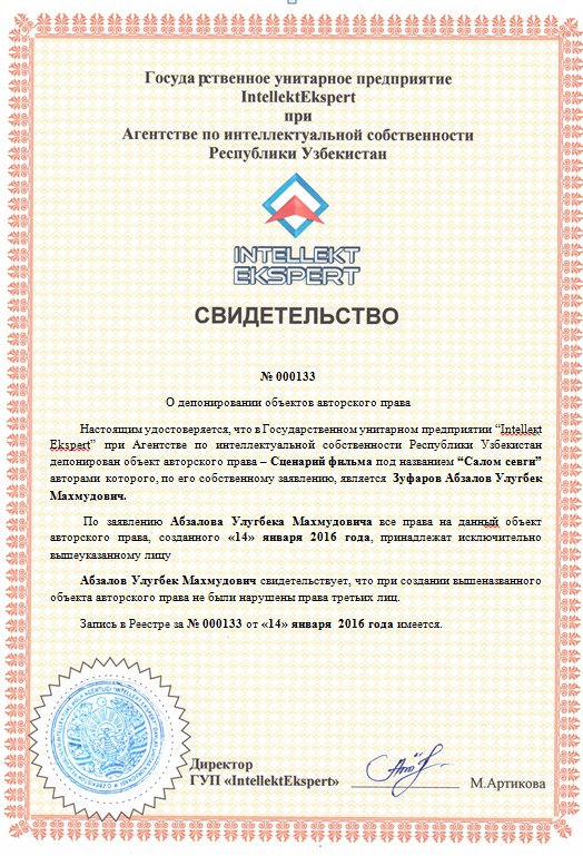 | 10030 | №000133 | Сценарий фильма-“Салом севги” | Зуфаров Абзалов Улугбек Махмудович. | Зуфаров Абзалов Улугбек Махмудович. | 01/14/2016 | ![]() |