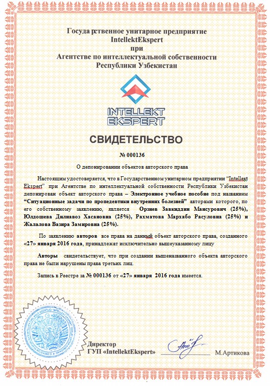 | 10027 | №000136 | Электронное учебное пособие-“Ситуационные задачи по пропедевтики внутренних болезней” | Орзиев Завкиддин Мансурович (25%), Юлдошева Дилнавоз Хасановна (25%), Рахматова Мархабо Расуловна (25%) и Жалалова Вазира Замировна (25%). | Орзиев Завкиддин Мансурович, Юлдошева Дилнавоз Хасановна , Рахматова Мархабо Расуловна и Жалалова Вазира Замировна . | 01/27/2016 | ![]() |