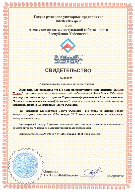 | 10026 | №000137 | Справочно-информационная база-“Единый медицинский каталог.Узбекистан” | Бессмертный Тимур Юрьевич | Бессмертный Тимур Юрьевич | 01/26/2016 | ![]() |