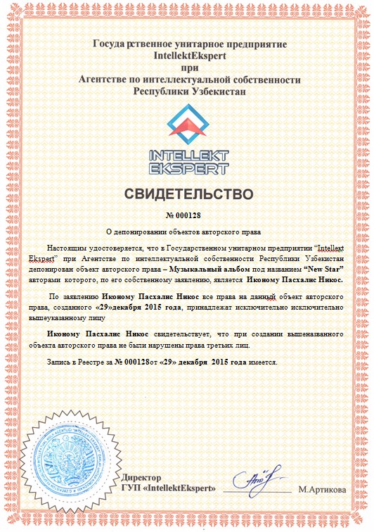 | 10035 | №000128 | Музыкальный альбом-“New Star” | Иконому Пасхалис Никос | Иконому Пасхалис Никос | 12/29/2015 | ![]() |