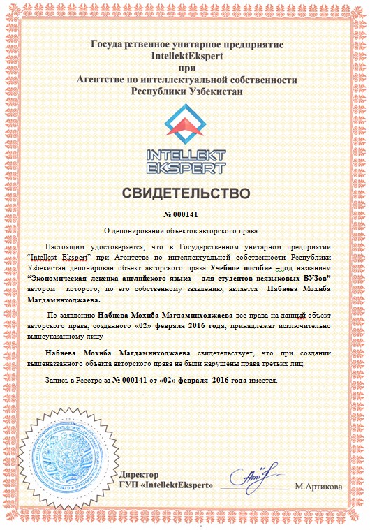 | 10022 | №000141 | Учебное пособие -“Экономическая лексика английского языка для студентов неязыковых ВУЗов” | Набиева Мохиба Магдаминходжаева. | Набиева Мохиба Магдаминходжаева. | 02/02/2016 | ![]() |