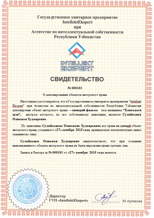 | 10060 | №000103 | Сценарий фильма-“Елкамдаги қуш" | Сулаймонов Олимжон Худаярович. | Сулаймонов Олимжон Худаярович. | 10/27/2015 | ![]() |