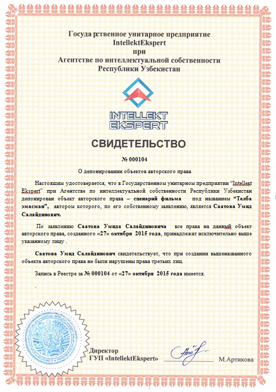 | 10059 | №000104 | Сценарий фильма-“Телба эмасман" | Саатова Умид Салайдинович. | Саатова Умид Салайдинович. | 10/27/2015 | ![]() |