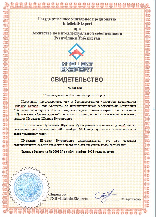 | 10058 | №000105 | Киносценарий-“Кўрмаганни кўргани қурсин” | Нуралиев Шухрат Кучкарович | Нуралиев Шухрат Кучкарович | 11/09/2015 | ![]() |