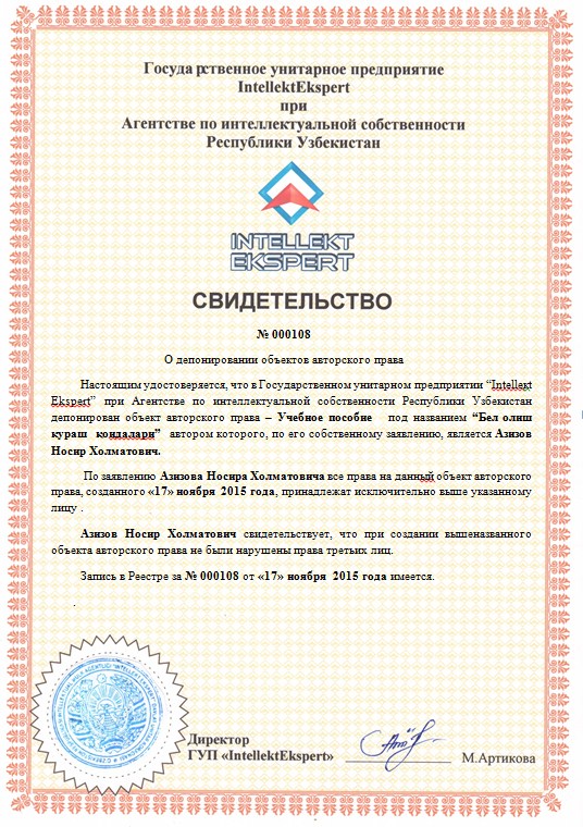 | 10056 | №000107 | Учебное пособие-“Боғдан дастурхонгача” усулининг самарадорлигини оширишда синергетик самарадан фойдаланиш йўллари” | Пардаев Олим Мамаюнксович. | Пардаев Олим Мамаюнксович. | 11/17/2015 | ![]() |