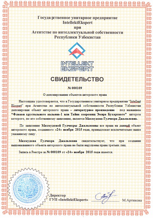 | 10054 | №000109 | Литературное произведение-“Флакон хрустального кальяна-1 или Тайна сокровищ Эмира Бухарского” | Махмудова Гулчехра Джалаловна. | Махмудова Гулчехра Джалаловна. | 11/24/2015 | ![]() |