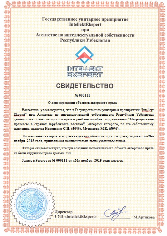 | 10052 | №000111 | Учебное пособие-“Миграционные процессы в странах зарубежного востока” | Кононенко С.Н. (50%), Мукимова М.К. (50%). | Кононенко С.Н. , Мукимова М.К.. | 11/26/2015 | ![]() |