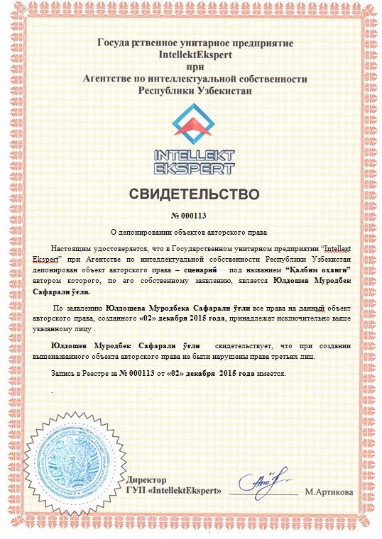 | 10050 | №000113 | Сценарий-“Қалбим оҳанги" | Юлдошев Муродбек Сафарали ўғли | Юлдошев Муродбек Сафарали ўғли | 12/02/2015 | ![]() |
