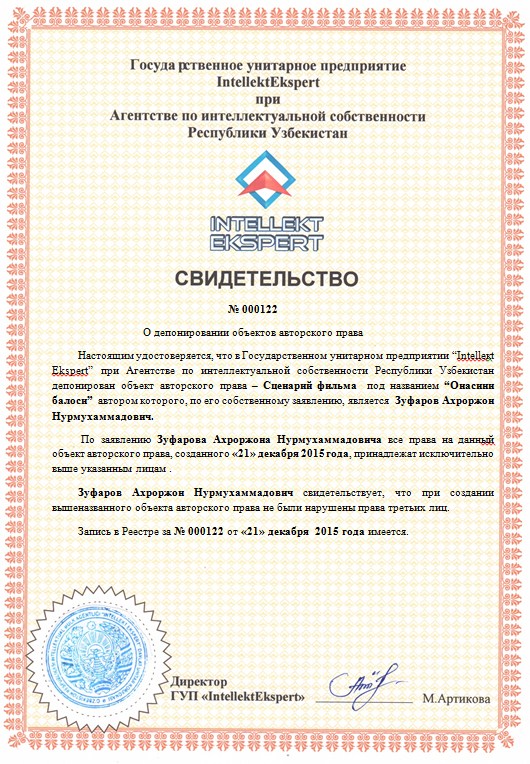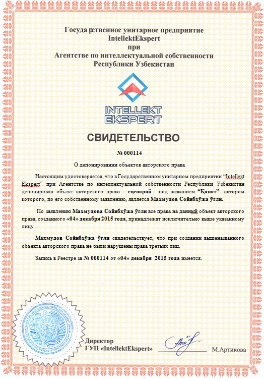 | 10049 | №000114 | Сценарий-“Қанот” | Махмудов Сойибҳўжа ўгли. | Махмудов Сойибҳўжа ўгли. | 12/04/2015 | ![]() |