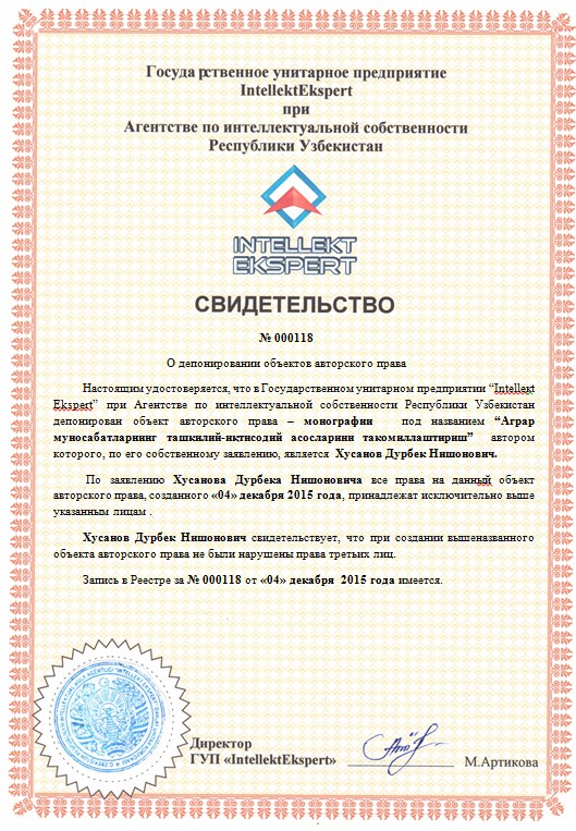 | 10045 | №000118 | Монографии-“Аграр муносабатларнинг ташкилий-иқтисодий асосларини такомиллаштириш” | Хусанов Дурбек Нишонович | Хусанов Дурбек Нишонович | 12/04/2015 | ![]() |
