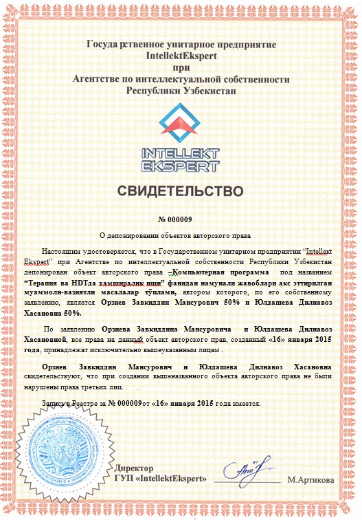 | 10154 | №000009 | Компьютерная программа под названием “Терапия ва HDTда хамширалик иши” фанидан намунали жавоблари акс эттирилган муаммоли-вазиятли масалалар тўплами | Орзиев Завкиддин Мансурович 50% и Юлдашева Дилнавоз Хасановна 50% | Орзиев Завкиддин Мансурович и Юлдашева Дилнавоз Хасановна | 01/16/2015 | ![]() |