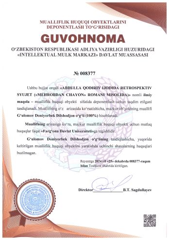 | 1730 | №008377 | Ilmiy maqola – "ABDULLA QODIRIY IJODIDA RETROSPEKTIV SYUJET («MEHROBDAN CHAYON» ROMANI MISOLIDA)" | G‘ulomov Doniyorbek Dilshodjon o‘g‘li (100%) | Farg‘ona Davlat Universiteti | 12/25/2024 | ![]() |
