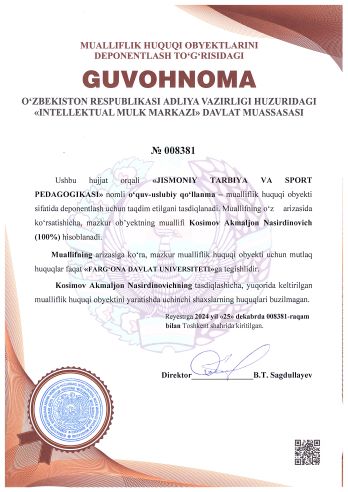 | 1726 | №008381 | O‘quv-uslubiy qo‘llanma – "JISMONIY TARBIYA VA SPORT PEDAGOGIKASI" | Kosimov Akmaljon Nasirdinovich (100%) | FARG‘ONA DAVLAT UNIVERSITETI | 12/25/2024 | ![]() |