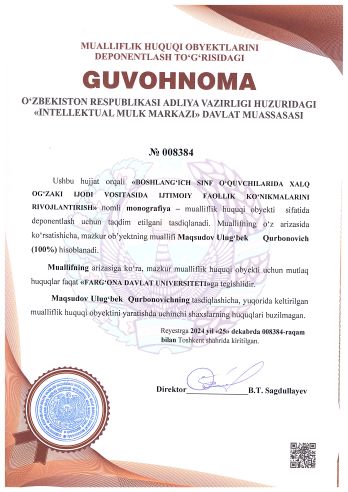 | 1723 | №008384 | Monografiya –"BOSHLANG‘ICH SINF O‘QUVCHILARIDA XALQ OG‘ZAKI IJODI VOSITASIDA IJTIMOIY FAOLLIK KO‘NIKMALARINI RIVOJLANTIRISH" | Maqsudov Ulug‘bek Qurbonovich (100%) | FARG‘ONA DAVLAT UNIVERSITETI | 12/25/2024 | ![]() |