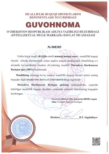 | 1722 | №008385 | Matnsiz musiqa asari – "RAQS" | Murodova Durdonaxon Ryimjon qizi (100%) | FARG‘ONA DAVLAT UNIVERSITETI | 12/25/2024 | ![]() |