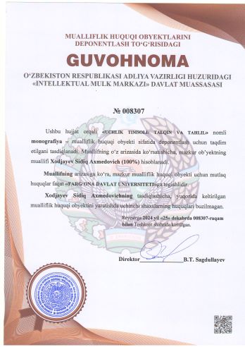 | 1800 | №008307 | Monografiya –"UCHLIK TIMSOLI: TALQIN VA TAHLIL" | Xodjayev Sidiq Axmedovich (100%) | FARG‘ONA DAVLAT UNIVERSITETI | 12/25/2024 | ![]() |