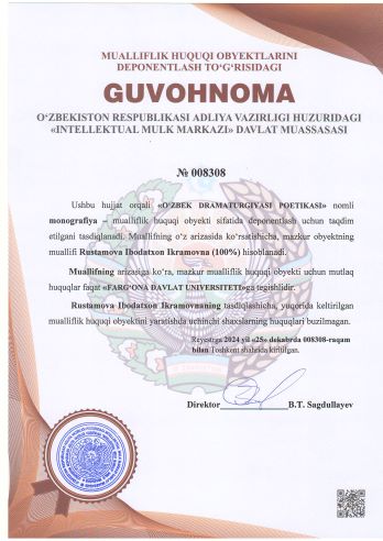 | 1799 | №008308 | Monografiya –"O‘ZBEK DRAMATURGIYASI POETIKASI" | Rustamova Ibodatxon Ikramovna (100%) | FARG‘ONA DAVLAT UNIVERSITETI | 12/25/2024 | ![]() |
