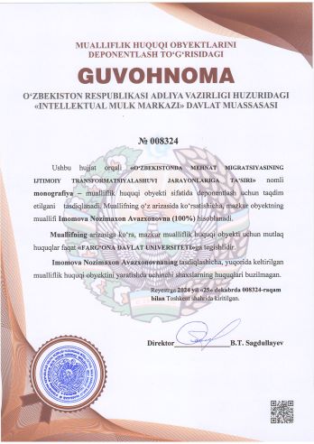 | 1783 | №008324 | Monografiya –"O‘ZBEKISTONDA MEHNAT MIGRATSIYASINING IJTIMOIY TRANSFORMATSIYALASHUVI JARAYONLARIGA TA’SIRI" | Imomova Nozimaxon Avazxonovna (100%) | FARG‘ONA DAVLAT UNIVERSITETI | 12/25/2024 | ![]() |