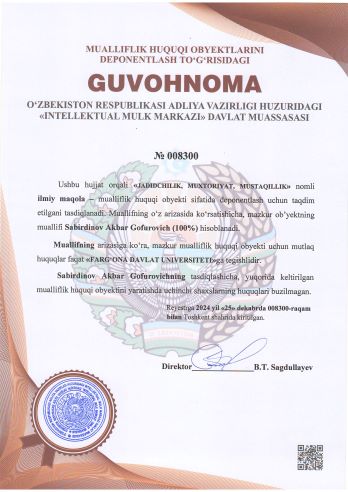 | 1807 | №008300 | Ilmiy maqola – "JADIDCHILIK, MUXTORIYAT, MUSTAQILLIK" | Sabirdinov Akbar Gofurovich (100%) | FARG‘ONA DAVLAT UNIVERSITETI | 12/25/2024 | ![]() |