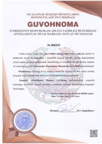| 1802 | №008305 | Monografiya –"XX ASR O‘ZBEK QISSALARIDA BOLA OBRAZI: DAVR VA RUHIYAT" | Umurzakov Rustamjon Maxamadovich (100%) | FARG‘ONA DAVLAT UNIVERSITETI | 12/25/2024 | ![]() |