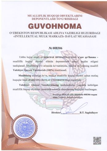 | 1801 | №008306 | O‘quv qo‘llanma – "УЗБЕКСКАЯ ЛИТЕРАТУРА" | Yulchiyev Qaxxor Vaxobovich (100%) | FARG‘ONA DAVLAT UNIVERSITETI | 12/25/2024 | ![]() |