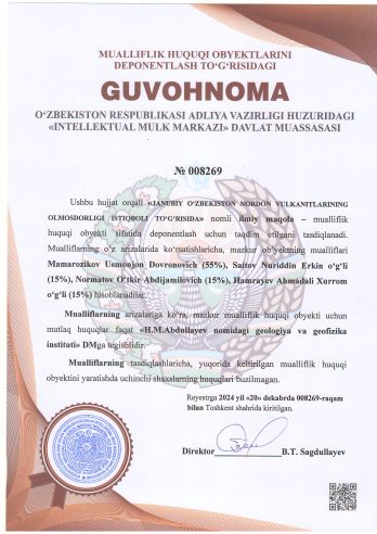 | 1838 | №008269 | Ilmiy maqola – "JANUBIY O‘ZBEKISTON NORDON VULKANITLARINING OLMOSDORLIGI ISTIQBOLI TO‘G‘RISIDA" | Mamarozikov Usmonjon Dovronovich (55%), Saitov Nuriddin Erkin o‘g‘li (15%), Normatov O‘tkir Abdijamilovich (15%), Hamrayev Ahmadali Xurrom o‘g‘li (15%) | «H.M.Abdullayev nomidagi geologiya va geofizika instituti» DM | 12/20/2024 | ![]() |