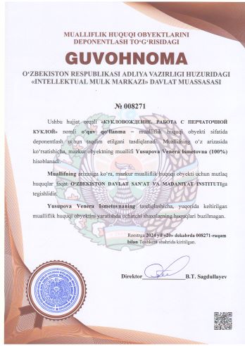 | 1836 | №008271 | O‘quv qo‘llаnmа - "КУКЛОВОЖДЕНИЕ. РАБОТА С ПЕРЧАТОЧНОЙ КУКЛОЙ" | Yusupova Venera Ismetovna (100%) | O‘ZBEKISTON DAVLAT SAN’AT VA MADANIYAT INSTITUTI | 12/20/2024 | ![]() |