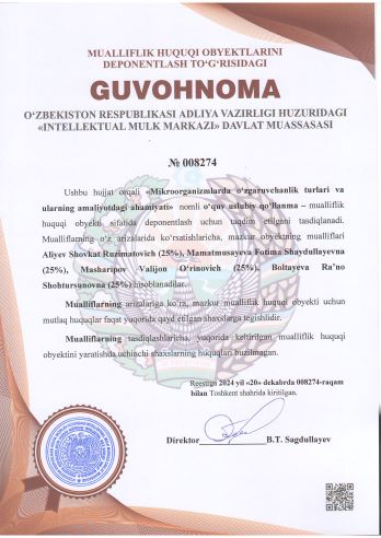 | 1835 | №008272 | O‘quv uslubiy qo‘llanma – "Tuberkulyoz, moxov, aktinomikoz qo‘zg‘atuvchilariga xarakteristika va laboratoriya tashxisi" | Nuruzova Zuxra Abdikadirovna (25%), Fayzullayeva Zamira Raxmatovna (25%), Boltayev Farxod Ruzimovich (25%), Orinbayeva Zuxra Naurizbayevna (25%) | Nuruzova Zuxra Abdikadirovna, Fayzullayeva Zamira Raxmatovna, Boltayev Farxod Ruzimovich, Orinbayeva Zuxra Naurizbayevna | 12/20/2024 | ![]() |