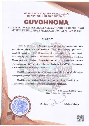 | 1832 | №008275 | O‘quv uslubiy qo‘llanma – "Мikrооrgаnizmlаr ekоlоgiyasi. Тuprоq, suv, hаvо mikrоflоrаsi, ulаrni o‘rgаnish usullаri" | Mamatmusayeva Fotima Shaydullayevna (25%), Yodgorova Nodira Turgunbayevna (25%), Aliyev Shovkat Ruzimatovich (25%), Shamuratov Abror Shonazarovich (25%) | Mamatmusayeva Fotima Shaydullayevna, Yodgorova Nodira Turgunbayevna, Aliyev Shovkat Ruzimatovich, Shamuratov Abror Shonazarovich | 12/20/2024 | ![]() |