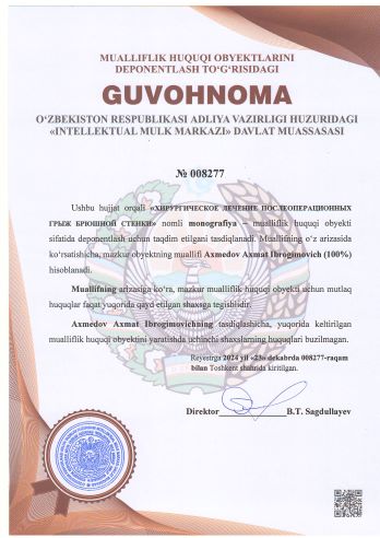 | 1830 | №008277 | Monografiya –"ХИРУРГИЧЕСКОЕ ЛЕЧЕНИЕ ПОСЛЕОПЕРАЦИОННЫХ ГРЫЖ БРЮШНОЙ СТЕНКИ" | Axmedov Axmat Ibrogimovich (100%) | Axmedov Axmat Ibrogimovich | 12/23/2024 | ![]() |