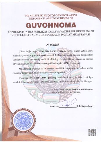 | 1824 | №008283 | O‘quv qo‘llanma – "UMUMIY PSIXOLOGIYA" | Tohirova Mohigul Umir qizi (100%) | Tohirova Mohigul Umir qizi | 12/24/2024 | ![]() |