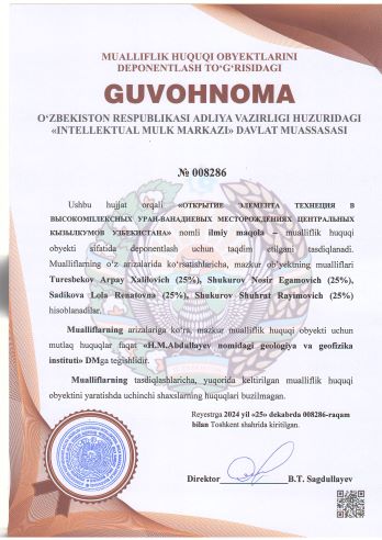 | 1821 | №008286 | Ilmiy maqola – "ОТКРЫТИЕ ЭЛЕМЕНТА ТЕХНЕЦИЯ В ВЫСОКОМПЛЕКСНЫХ УРАН-ВАНАДИЕВЫХ МЕСТОРОЖДЕНИЯХ ЦЕНТРАЛЬНЫХ КЫЗЫЛКУМОВ УЗБЕКИСТАНА" | Turesbekov Arpay Xalilovich (25%), Shukurov Nosir Egamovich (25%), Sadikova Lola Renatovna (25%), Shukurov Shuhrat Rayimovich (25%) | «H.M.Abdullayev nomidagi geologiya va geofizika instituti» DM | 12/25/2024 | ![]() |