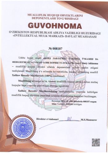 | 1900 | №008187 | Ilmiy ishlanma-"ҚАНД ЛАВЛАГИДА ТАЖРИБА ЎТКАЗИШ ВА ФЕНОЛОГИК КУЗАТУВЛАР ОЛИБ БОРИШ УСЛУБЛАРИ" | Хаlikov Baxodir Meylikovich (100%) | Хаlikov Baxodir Meylikovich | 12/10/2024 | ![]() |