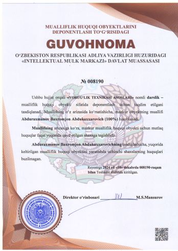 | 1897 | №008190 | Darslik –"YORUG‘LIK TEXNIKASI ASOSLARI" | Abduraxmanov Baxromjon Abdukaxxarovich (100%) | Abduraxmanov Baxromjon Abdukaxxarovich | 12/10/2024 | ![]() |
