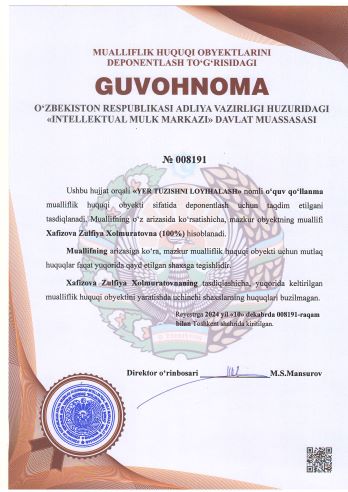 | 1896 | №008191 | O‘quv qoʻllanma- "YER TUZISHNI LOYIHALASH" | Xafizova Zulfiya Xolmuratovna (100%) | Xafizova Zulfiya Xolmuratovna | 12/10/2024 | ![]() |